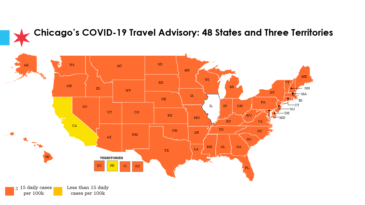 Za bezpieczne do podróżowania uznano Kalifornię i Portoryko. W ubiegłym tygodniu do tego grona dołączono Dystrykt Kolumbia i Connecticut. Za stany o podwyższonym ryzyku zakażenia uznaje się te, w których dzienna liczba zakażeń przekracza 15 na 100 tysięcy mieszkańców. Obecnie w skali całego kraju wynosi ona dziennie 38 na 100 tysięcy mieszkańców. Władze Chicago zalecają osobom po powrocie z „pomarańczowych rejonów” dobrowolną kwarantannę i poddanie się testowi na obecność koronawirusa. Na liście stanów i rejonów zależnych o podwyższonym ryzyku zakażenia COVID-19 są: Alabama, Alaska, Arizona, Arkansas, Connecticut, Kolorado, Delaware, Floryda, Georgia, Hawaje, Idaho, Indiana, Iowa, Kansas, Kentucky, Luizjana, Maine, Maryland, Massachusetts, Michigan, Minnesota, Mississippi, Missouri, Montana, Nebraska, Nevada, New Jersey, New Hampshire, Nowy Meksyk, Nowy Jork, Karolina Północna, Dakota Północna, Ohio, Oklahoma, Oregon, Pensylwania, Rhode Island, Karolina Południowa ,Dakota Południowa, Tennessee, Teksas, Utah, Vermont, Wirginia, Washington, Wirginia Zachodnia , Wisconsin, Wyoming, Guam i Wyspy Dziewicze.