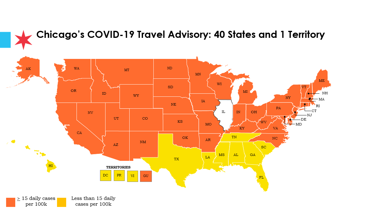 Oznacza to, że liczba nowych zakażeń COVID-19 wynosi w tych stanach 15 lub więcej na 100 tysięcy mieszkańców. Obecnie 40 stanów i jedno terytorium zależne od USA uznawane jest przez Chicago za obszary ryzykowne dla osób planujących podróż. Wykaz zaktualizowano tuż przed Thanksgiving, kiedy to wiele osób wybiera się w podróż by święto to spędzić z rodziną i bliskimi lub udaje się na krótkie wakacje. Chicago uznaje, że podróże ze względu na pandemię bezpieczne są tylko do stanów Alabama, Waszyngton, Floryda, Georgia, na Hawaje, do Luizjany, Mississippi, Karoliny Południowej, Tennessee, Teksasu a także do rejonów zależnych od USA: Portoryko i na Wsypy Dziewicze.