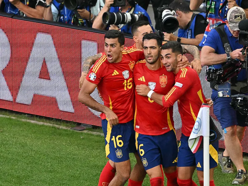 Piłkarze reprezentacji Hiszpanii awansowali do półfinału mistrzostw Europy. W meczu ćwierćfinałowym Hiszpania wygrała po dogrywce z gospodarzami turnieju Niemcami 2:1 (0:0). W 51. minucie gola dla Hiszpanii strzelił Dani Olmo. W 89 minucie wyrównał Florian Wirtz. Decydującą bramkę w 119 minucie zdobył Mikel Merino. W drugim piatkowym ćwierćfinale Francja w Hamburgu po podstawowym czasie gry i dogrywce Francuzi remisowała z Portugalczykami 0:0. W serii rzutów karnych Francja wygrała 5-3. Decydującego karnego dla Francuzów wykorzystał Theo Hernández.