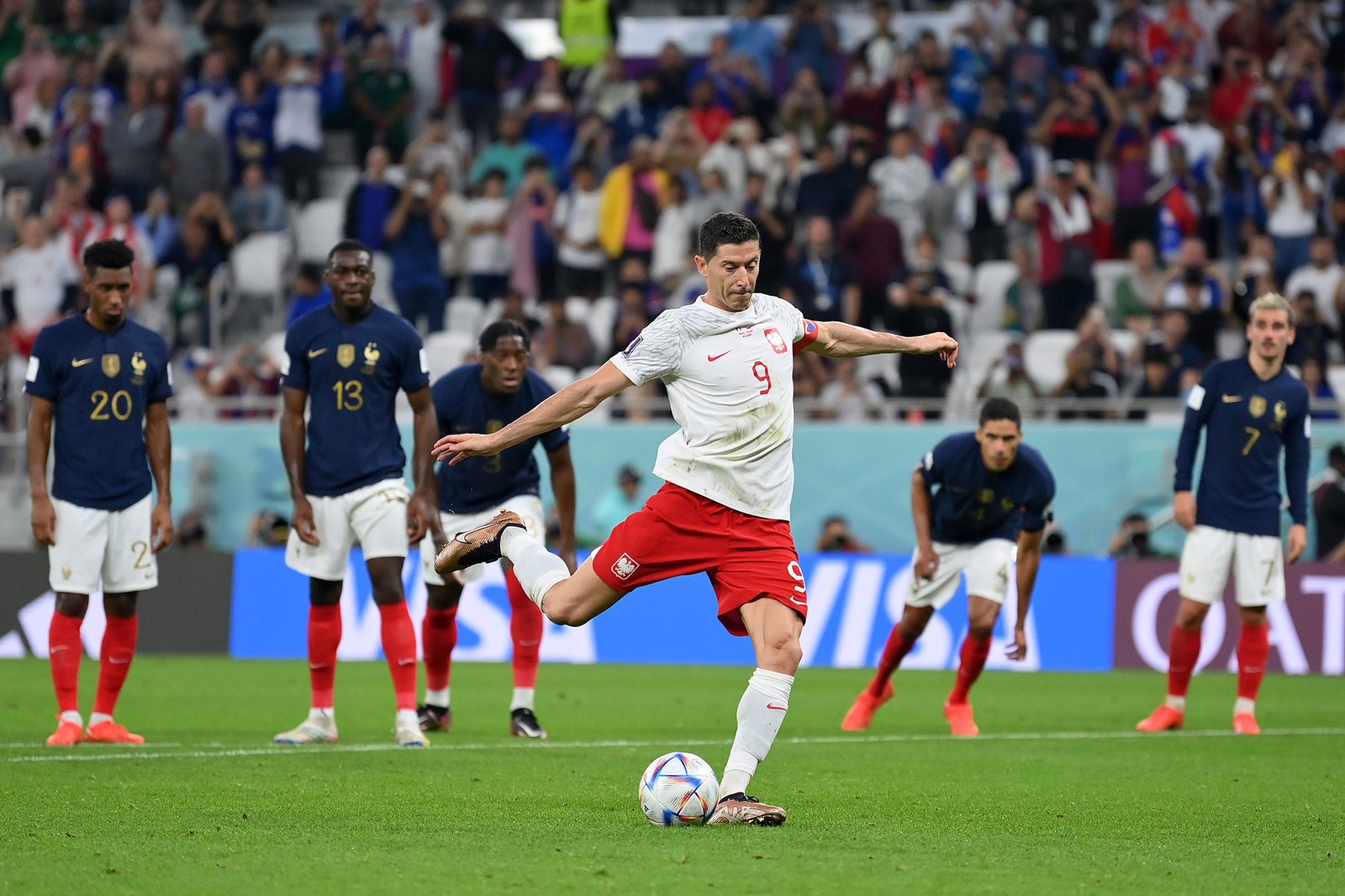 Piłkarska reprezentacja Polski odpadła w 1/8 finału mistrzostw świata w Katarze. W rozegranym na stadionie Al Thumama w Dosze spotkaniu tej fazy „Biało-Czerwoni” przegrali z Francuzami 1:3 (0:1). Dwie bramki dla zwycięzców zdobył Kylian Mbappé (74′, 90+1′), a jedno trafienie dołożył Olivier Giroud (44′). Jedynego gola dla „Biało-Czerwonych” strzelił z rzutu karnego w doliczonym czasie gry drugiej połowy Robert Lewandowski (90+9′). „Były dobre momenty, po których wyprowadzaliśmy groźne akcje i utrzymywaliśmy piłkę na połowie przeciwnika. Może nie było ich zbyt wiele, ale mieliśmy kilka świetnych momentów, które mogły zakończyć się bramką. Bardzo żałuję tego strzału Piotr Zielińskiego i dobitki, bo to była nasza najlepsza okazja. To wszystko toczyło się przy stanie 0:0. Na podsumowania przyjdzie czas. Po meczu są emocje, głowy i serca są gorące. Chcę podziękować piłkarzom, całemu naszemu sztabowi i wszystkim tym, którzy pomagali nam się przygotować do tych mistrzostw, byli z nami i wspierali nas. Nasza przygoda się zakończyła dzisiaj. Przegraliśmy z aktualnym mistrzem świata i jednym z faworytów do zdobycia tytułu” – skomentował po meczu selekcjoner Czesław Michniewicz.