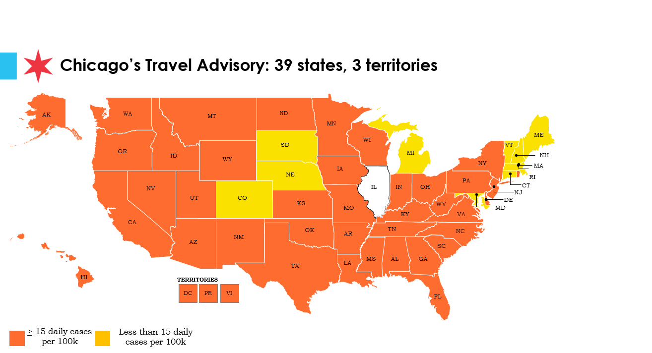 W sumie na pandemicznej mapie Chicago umieszczono już 39 stanów i 3 terytoria zależne. Po przyjeździe z nich zalecana jest kwarantanna lub negatywny wynik testu na COVID-19. Badaniu należy się poddać do 72 godzin po przyjeździe. Za regiony o podwyższonym ryzyku zakażenia uznaje się te, gdzie dzienna liczba zakażeń przekracza 15 na 100 tysięcy mieszkańców. Mapa ponownie aktualizowana jest co tydzień. Na pomarańczowo oznaczone są na niej następujące stany: Alabama, Alaska, Arizona, Arkansas, Kalifornia, Delaware, Dystrykt Kolumbia, Floryfa, Georgia, Hawaje, Idaho, Indiana, Iowa, Kansas, Kentucky, Luizjana, Minnesota, Mississippi, Missouri, Montana, Nevada, New Jersey, Nowy Meksyk, Nowy Jork, Karolina Północna, Dakota Północna, Ohio, Oklahoma, Oregon, Pensylwania, Rhode Island, Karolina Południowa, Tennessee, Teks, Utah, Virginia, stan Waszyngton, Wirginia Zachodnia, Wisconsin, Wyoming oraz Portoryko i Wyspy Dziewicze.