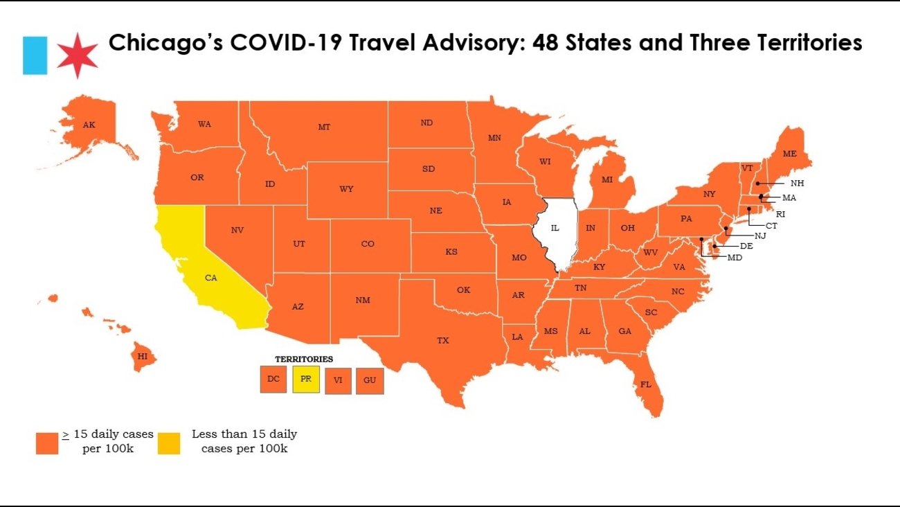 Pozostałe stany na mapie widnieją w kolorze pomarańczowym czyli oznacza to , że dzienna liczba zakażeń przekracza 15 na 100 tysięcy mieszkańców. Władze Chicago zalecają po przyjeździe z nich dobrowolną kwarantannę i poddanie się testowi na obecność COVID-19. Najwięcej zakażeń noruj się na Alasce 112 na 100 tysięcy i w Wirginii Zachodniej 93 na 100 tysięcy mieszkańców. W Chicago dzienna liczba zakażeń spadła z 15 w ubiegłym tygodniu do 13 w tym na 100 tysięcy mieszkańców. W Illinois dzienna liczba wynosi 18 na 100 tysięcy mieszkańców.