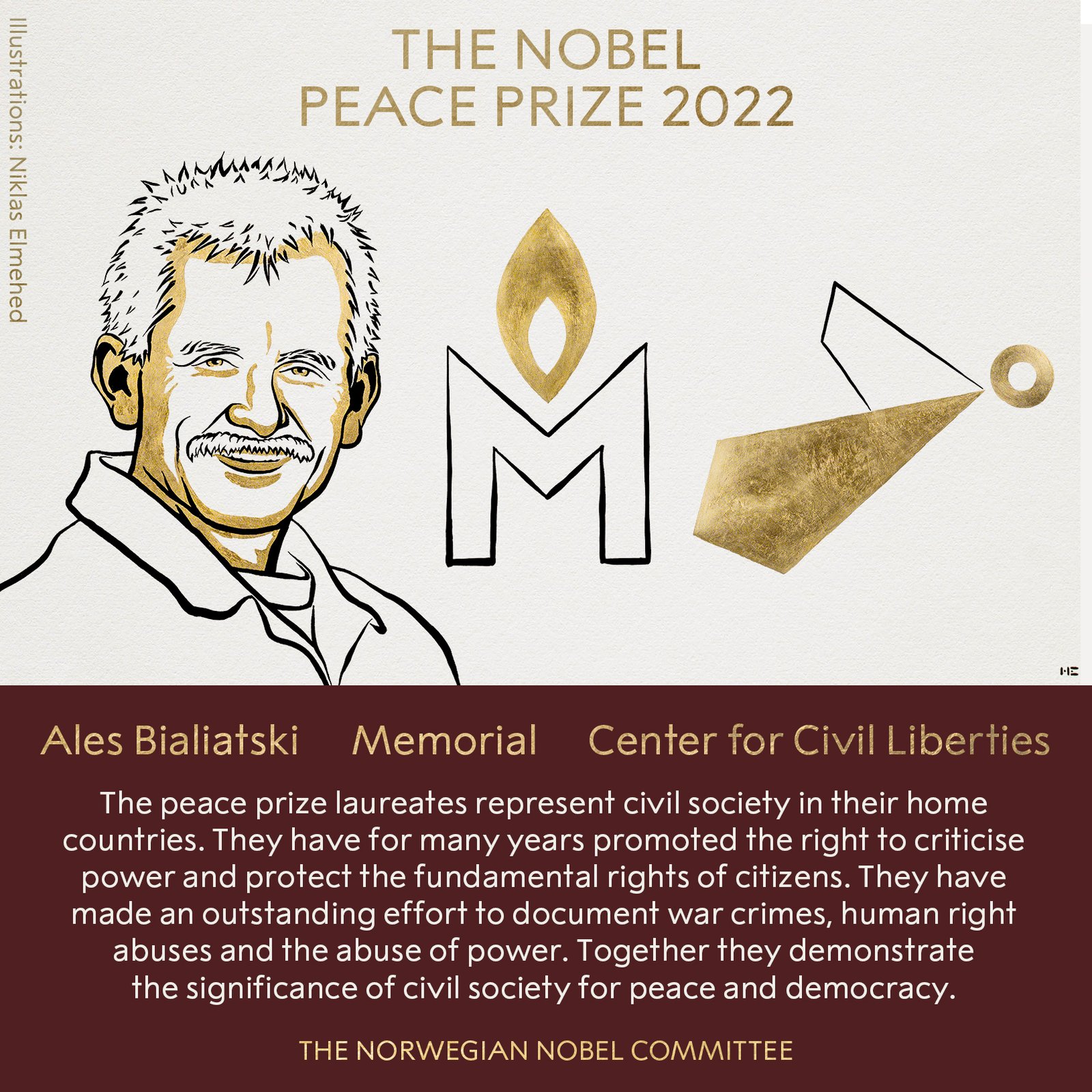 Laureat Pokojowej Nagrody Nobla Aleś Bialacki, założyciel białoruskiego ruchu obrony praw człowieka „Wiasna”, od ponad roku jest przetrzymywany w areszcie, a ruch „Wiasna” już wcześniej został zlikwidowany. W ostatniej przed aresztowaniem rozmowie z Polskim Radiem Aleś Bialacki mówił o tworzeniu dokumentacji przestępstw reżimu. „Rozpoczynamy rejestrowanie przypadków stosowania tortur, pobić i poranień, do których doszło w trakcie zatrzymań, w transporcie, w komisariatach milicji i w więzieniu, gdy człowiek już siedzi” – mówił Aleś Bialacki. Komitet noblowski przyznał również Pokojową Nagrodę rosyjskiemu Centrum Obrony Praw Człowieka „Memoriał”, które ujawnia przypadki represji, pomaga ich ofiarom i dokumentuje zbrodnie popełnione w okresie Związku Sowieckiego. Szef sekcji Polskiej Stowarzyszenia „Memoriał” Aleksandr Gurianow tuż przed decyzją władz Rosji o likwidacji organizacji wyrażał obawę o bezpieczeństwo zgromadzonych w archiwach dokumentów potwierdzających zbrodnie popełnione w okresie sowieckim i we współczesnej Rosji. Trzecim laureatem Pokojowej Nagrody Nobla jest ukraińska organizacja Centrum Wolności Obywatelskich.