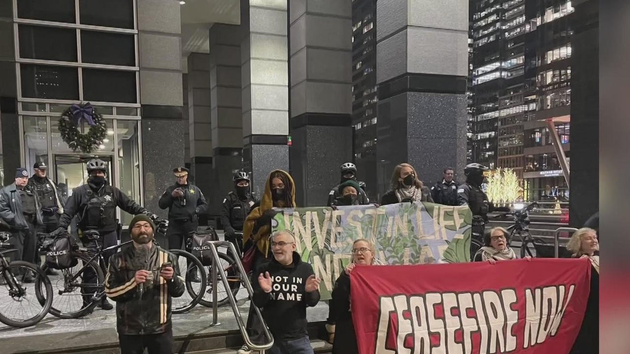 Dziesiątki uczestników biorących udział w manifestacji, ubranych na czarno zablokowało ruch na moście na Washington Street Bridge. Na budynku przy 100 N. Riverside Plaza wyświetlili menorę i napis „Trwałe zawieszenie broni teraz.” Właśnie w tym budynku znajdują się biura korporacyjne Boeinga. Boeing jest jednym z największych kontrahentów wojskowych dostarczających broń dla USA i Izraela. Protest został zorganizowany przez żydowskie grupy – Jewish Voice for Peace Chicago, Jewish Fast for Gaza i IfNotNow Chicago. Według organizatorów w proteście wzięło udział ponad 300 osób. W komunikacie prasowym protestujący stwierdzili, że „poświęcili 31-metrową menorę na Daley Plaza walce z ludobójstwem Izraela, apartheidem i okupacją Palestyny”, a następnie przemaszerowali przez dzielnicę Loop. Niektórzy protestujący wrócili później na Daley Plaza. Do protestu w Chicago doszło po tym, gdy prezydent Joe Biden wysłał swojego głównego doradcę ds. bezpieczeństwa do Izraela. Jake Sullivan spotkał się z premierem Benjaminem Netanjahu w obliczu rosnącego międzynarodowego oburzenia z powodu przemocy w Strefie Gazy. Netanjahu powiedział, że planuje kontynuować wojnę z Hamasem aż do „absolutnego zwycięstwa”.