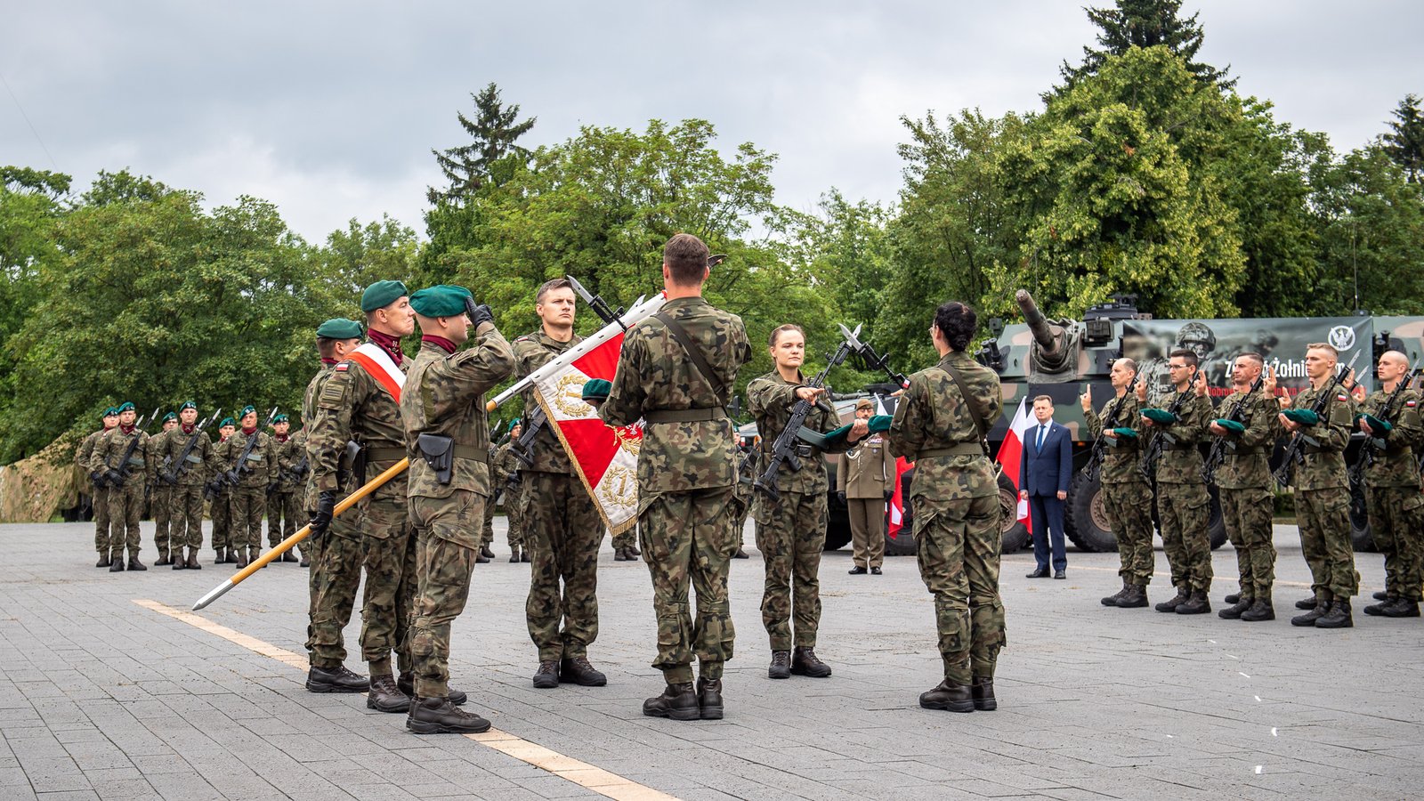 Przysięgę złożyło 80 żołnierzy, którzy ukończyli wcześniej 28-dniowe szkolenie podstawowe, obejmujące m.in. musztrę oraz szkolenie z bronią. Następnym etapem jest szkolenie specjalistyczne, które trwa 11 miesięcy i jest połączona z wykonywaniem obowiązków w jednostce wojskowej. Wicepremier, minister obrony narodowej Mariusz Błaszczak wskazał, że celem jest to,żeby jak najwięcej ludzi potrafiło posługiwać się bronią w razie potencjalnego zagrożenia. „Oby tej potrzeby nie było. Właśnie o to chodzi – żeby agresor wiedział, że Polska jest przygotowana do obrony. To jest cała doktryna odstraszania – sformułowana w NATO i rozwijana w ramach Sojuszu Północnoatlantyckiego – a więc budujemy silne Wojsko Polskie. Jednym z elementów silnego państwa polskiego jest właśnie dobrowolna zasadnicza służba wojskowa” – podkreślił minister Mariusz Błaszczak. W swoim przemówieniu szef MON zaznaczył, że polskie wojsko musi być dozbrajane, aby mogło odstraszać potencjalnych agresorów. „Lepsze uzbrojenie dla wojska to inwestycja w nasze bezpieczeństwo” – stwierdził wicepremier Mariusz Błaszczak. „W tym roku pierwsze baterie PATRIOT trafią na wyposażenie Wojska Polskiego – więcej – już trafiły pierwsze elementy. Oczekujemy kolejnego uzbrojenia” – przypomniał Mariusz Błaszczak. „Jeszcze w tym roku na wyposażenie Wojska Polskiego trafią koreańskie czołgi, również armatohaubice. Taka broń sprawdza się na Ukrainie. Widzimy, że na polu walki artyleria odgrywa rolę kluczową. Będziemy rozwijać ten rodzaj wojska” – zapewnił minister. Szef MON wyróżnił też pamiątkowymi ryngrafami żołnierzy, którzy ukończyli szkolenie z najwyższa lokatą. „Gratuluję wam i dziękuję, że zdecydowaliście się podjąć służbę w Wojsku Polskim. Większość z was po skończeniu kursu podstawowego – po złożeniu przysięgi – zostaje na kursie specjalistycznym, a więc zostanie żołnierzami zawodowymi” – powiedział Mariusz Błaszczak. Dodał, że to bardzo dobra decyzja, która świadczy o tym, że polskie wojsko się rozrasta i jest coraz silniejsze, co przekłada się na bezpieczeństwo kraju. Minister obrony narodowej Mariusz Błaszczak przekonywał też młode osoby do wstąpienia w szeregi Wojska Polskiego. Jak zaznaczył, w tym roku przygotowano 15 tysięcy miejsc w dobrowolnej zasadniczej służbie wojskowej. „Zachęcam tych wszystkich, którzy jeszcze nie zdecydowali, co chcą w życiu robić – żeby wstąpili do Wojska Polskiego. To są dobre warunki. 4560 złotych miesięcznie. Można zdobyć uprawnienia – np. operatora maszyn, prawo jazdy, patent nurka czy też skoczka spadochronowego” – podkreślił. Wicepremier przypomniał, że żołnierze, którzy odbyli dobrowolną zasadniczą służbę wojskową, mogą również odbyć terytorialną służbę wojskową albo przejść do rezerwy. W poniedziałek kolejnych tysiąc osób rozpocznie 28-dniowe szkolenie.