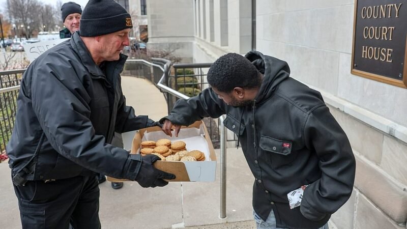 Przed sądem w Kenoshy aresztowano dwie osoby za zakłócanie porządku publicznego a szeryf rozdawał ciastka